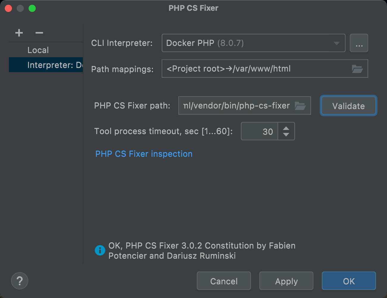 If PHPStorm does not automatically detect PHP CS Fixer path then add it manually: /var/www/html/vendor/bin/php-cs-fixer