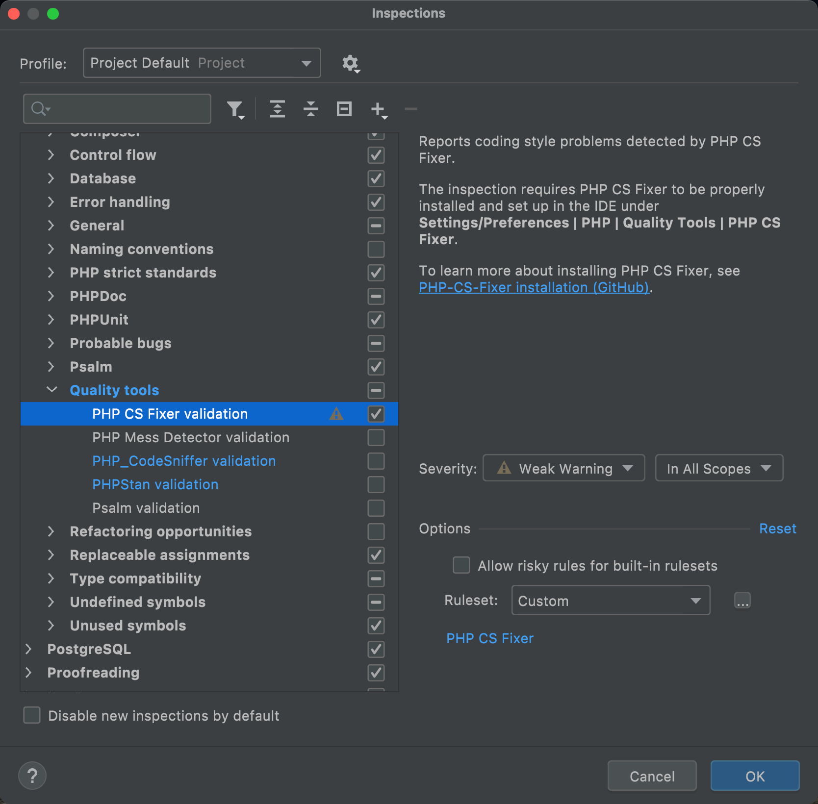 Next, click PHP CS Fixer inspection link, it will open up PHPStorm's inspections configuration.