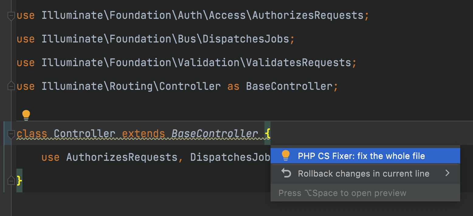 Now everytime PHPStorm notices coding style violation it will show a "warning" message and offer to fix the file for you